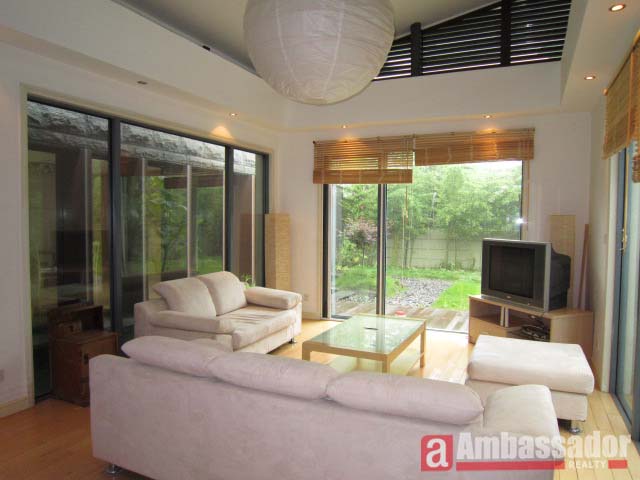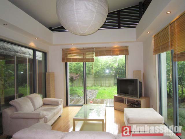 This 4 bedroomed villa features stylish glass wall on three sides in the living room which offers you a panoramic views of the back yard. Ccomfortable sofa sets and a coffee table makes you enjoy the sunshine and beautiful view of the lush greens outside.