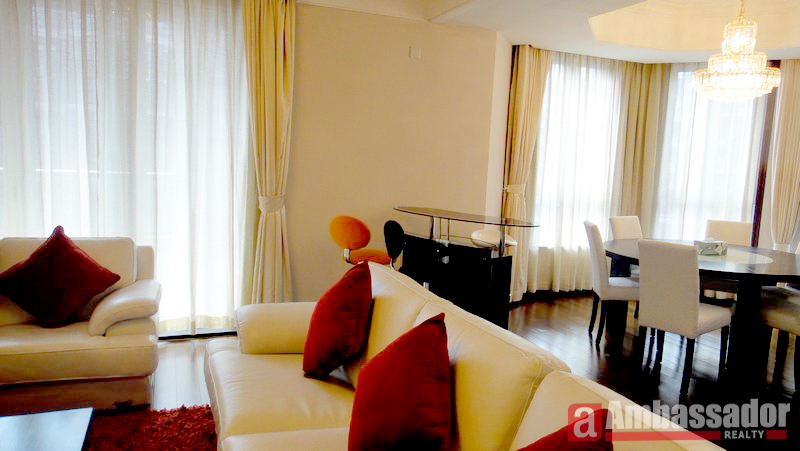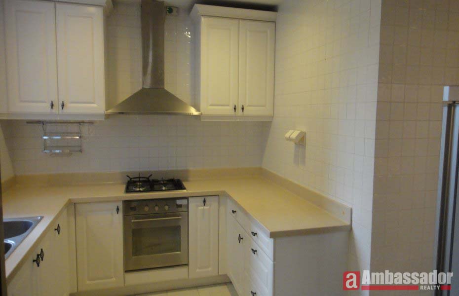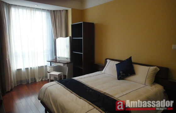This 3 bedroomed apartment in shanghai features spacious living room with floor to ceiling windows. A cute dining area faces to the bay windows on another side of the living room. Bedroom with a dressing table and a bookshelf can meet your different demand. Airy kitchen room is well equipped with quality appliances.
