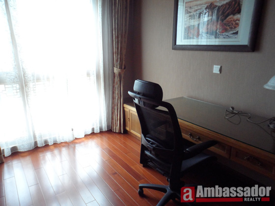 This 3 bedroomed apartment in shanghai features bright and sunny living room with high quality of leather and soft cushion furniture. French windows are provided in each room. A kid room with a cute bunk bed is especially suitable for the family with kids.