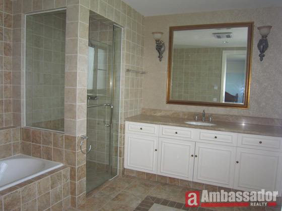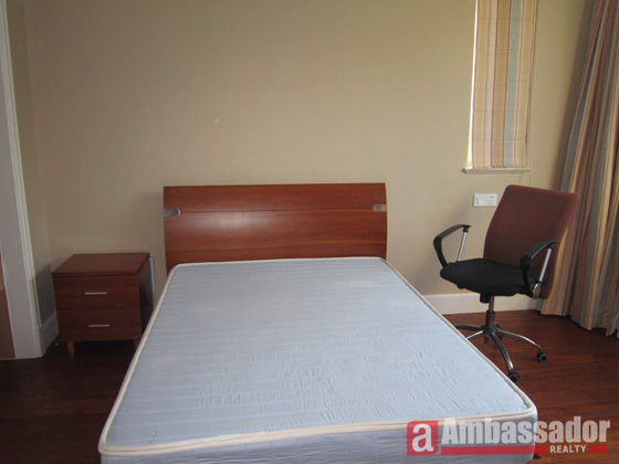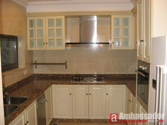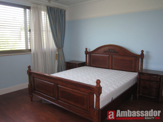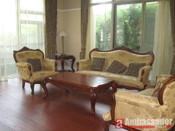 Multi-level four bedroomed villa with large living space with floor to ceiling windows enjoys a plenty of natural light, dark red wooden floors throughout, European style furnishings.