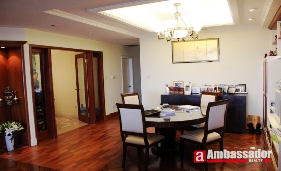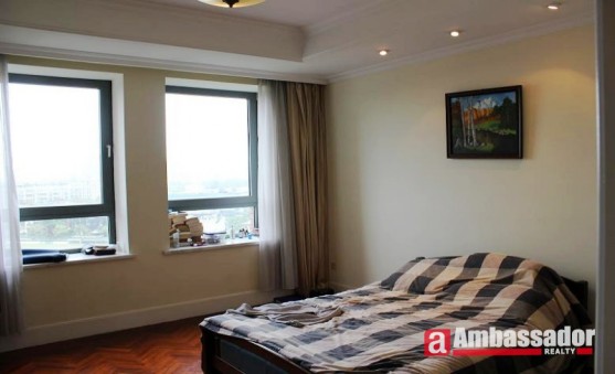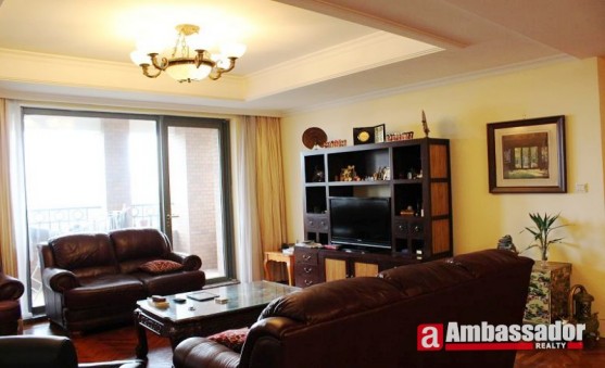 This elegant apartment is in Pudong Jinqiao Area.Full of high quality of wooden furniture.Big living room with French windows which is airy and bright.Nice balcony for viewing the outside views.Cool bedrooms with bay windows are airy and warm.Western style kitchen with a nice dining area.