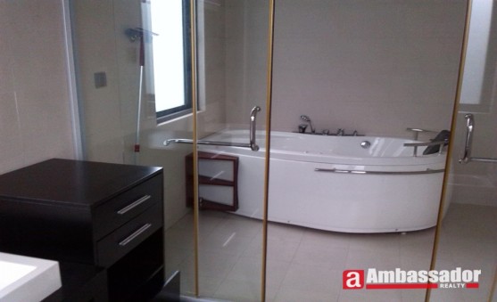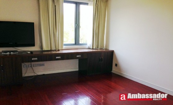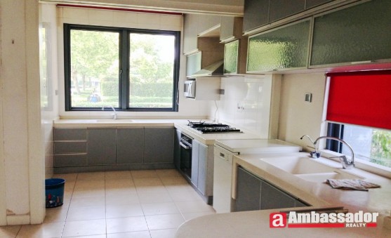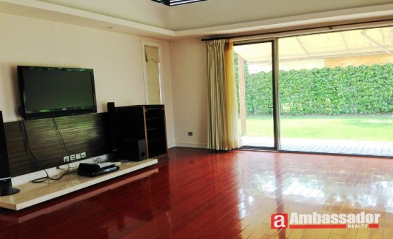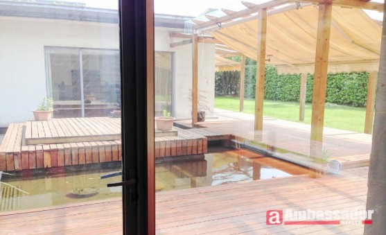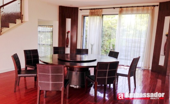 This fantastic villa features a lovely pool in the canopied backyard. Spacious living room with French windows leads to the huge garden full of lush greens. Bedroom with French windows provides you with an easy access to the garden. A large dining area in the living room can accommodate 8 people. Next to the dining table is the staircase leading to the second floor. Airy kitchen room is well equipped with quality appliances.