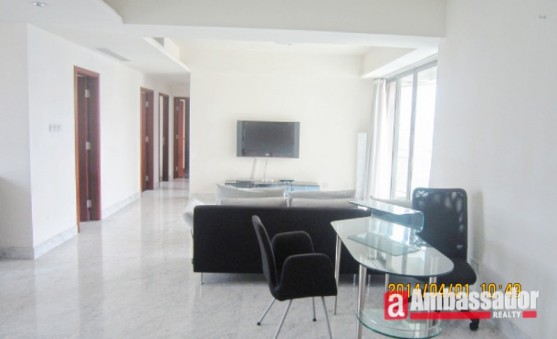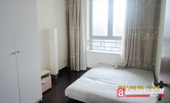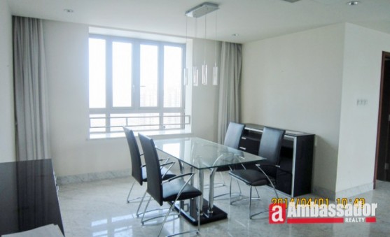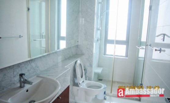 This 4 bedroomed apartment in shanghai features spacious living room with floor to ceiling windows. Cool marble floors are throughout in the living room and kitchen room. Bay windows in the bedroom provide you with an extra place of resting. The kitchen room with glass door leads to a huge balcony.