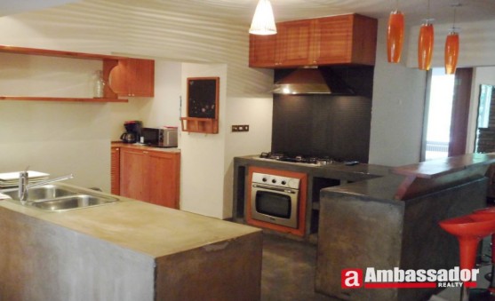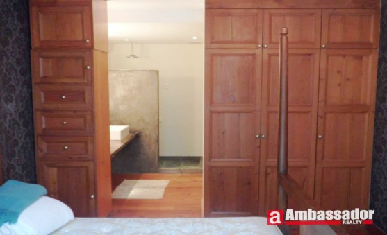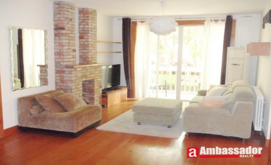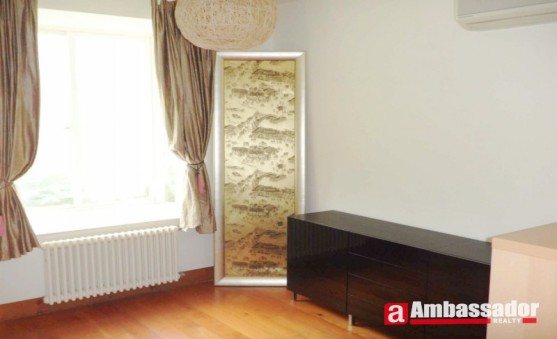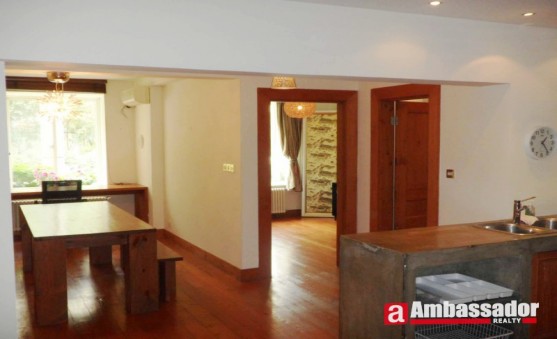 This fantastic 3 bedroomed apartment in shanghai features old house style decoration and log color furniture. A fireplace made of red bricks and cooking bench made of gray stone in the living room are the biggest highlights of this apartment. Bright living room with floor to ceiling windows leads to a huge balcony. Open-kitchen in the living room is well equipped with quality appliances. A cute dining area is connected with the kitchen. Bedrooms have en suite bathrooms.