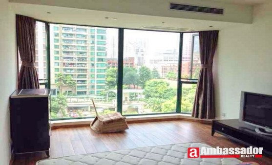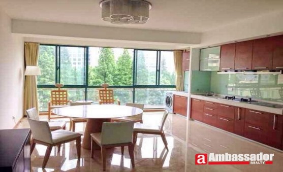 This 5 bedroomed apartment in shanghai features large windows in each room providing you with a beautiful view of lush greens in this compound. It is presented in excellent condition benefiting from well proportioned rooms including two spacious living rooms with floor to ceiling windows, a large kitchen room with a cute dining area, and five bedrooms with four en suite bathrooms.
