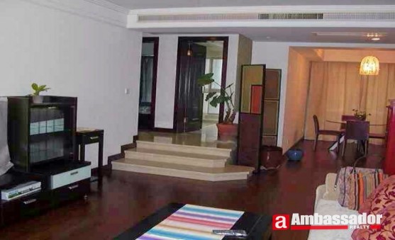 This 3 bedroomed apartment in shanghai features neo-classic decoration and nice layouts. Spacious living room with a colorful screen makes it special with modern furniture, reflecting a perfect combination of modern and old-fashioned styles. Special staircases leading to the bedrooms separates the space into two parts obviously. Three bedrooms have two en suite bathrooms. Fully furnished furniture and appliances can meet all your requirements of life.