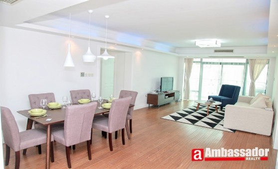 This stunning fully-furnished apartment includes three bedrooms, two living rooms and two bathrooms. Spacious and airy living rooms is decorated with beautiful sofa set and large french windows leading to a pleasant balcony. A spacious dinning area is in the living room with high quality wooden floor throughout. Cozy bedrooms with large windows offer a nice view outside with nice carpet spread out providing a really enjoyable environment to live in.