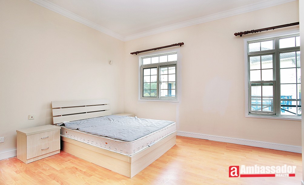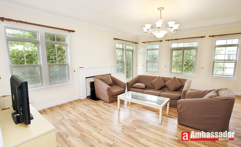 Arranged over two floor of a beautiful riverside villa compound just off HongQiao International Airport, this striking five bedroom free standing house offers bright, neutral interiors and an unblocked garden.