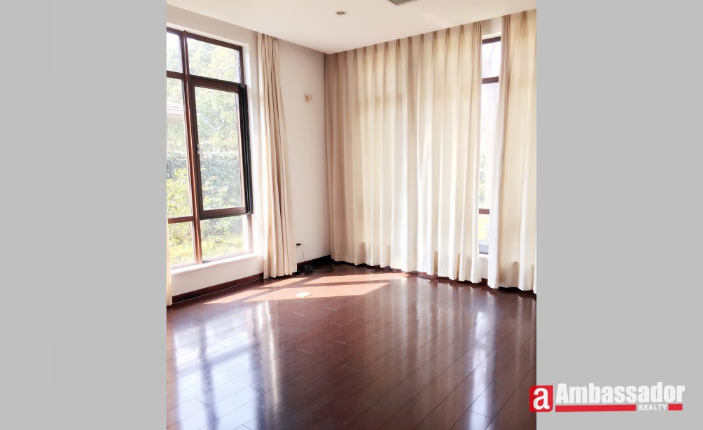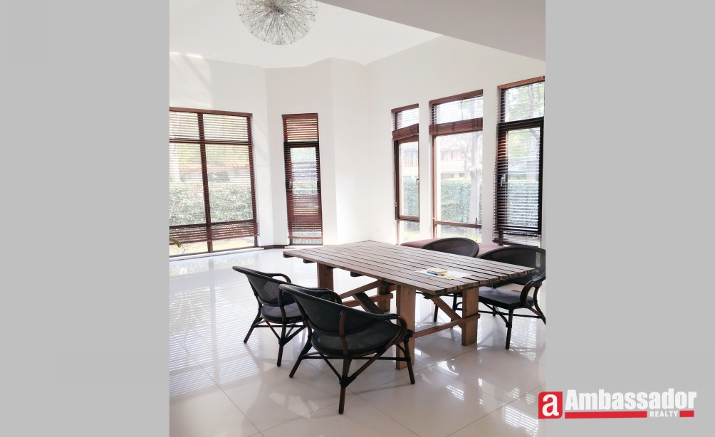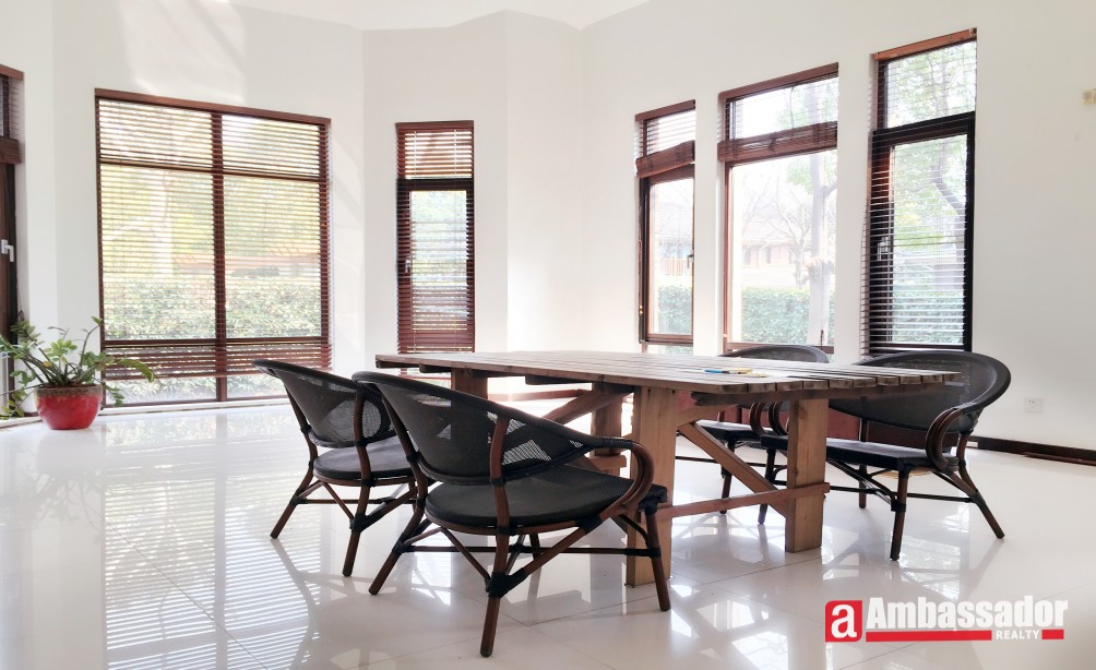 Wonderful villa with a large square meter and 4 bedrooms located in Pudong New Area provides many a club house facility. Shuttered windows available in living area provide warmth and bright in daytime and ensure privacy in nighttime. Large garden with green view can be seen through these windows.
