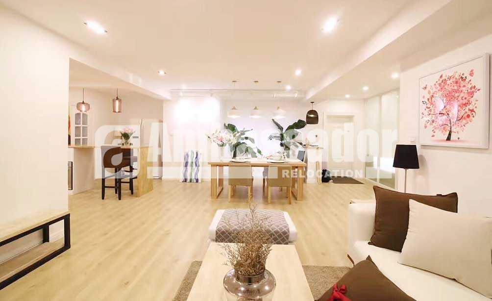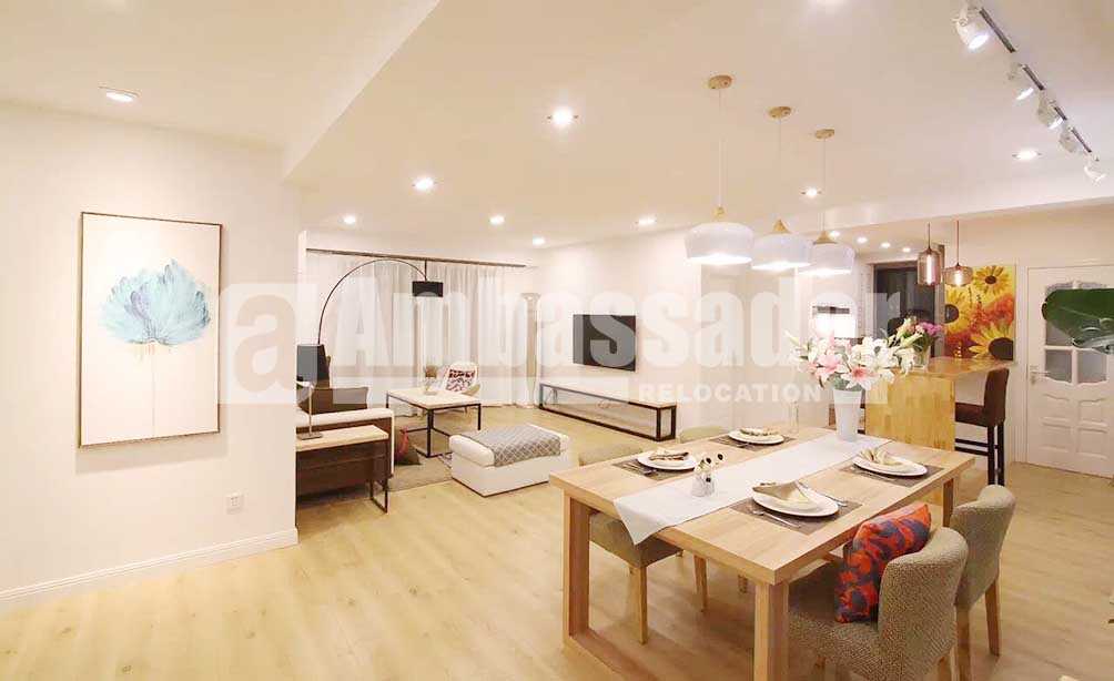 Located on North Xiangyang Road, hidden in the hundred-year-old tree path, the property enjoys a quiet environment but just 10 minutes’ walking to get Middle Huaihai Road Business Street and Metro Line 1, 10 & 12. Spacious living room with French window is bright and airy. Large dinning area is next to a cool open kitchen fully equipped with selected appliance and with a cute bar table. Generous bedrooms with elegant wardrobe provide places for clothing finishing. Tub available in the bathroom just adds enjoyment of bathing. Standing on the balcony, you will be surprised by the amazing night view of Shanghai from modern skyscrapers towering into the clouds to low block with red roof and yellow brick wearing a strong historical breathing well combining in the same picture.
