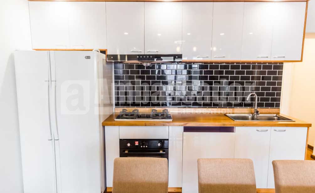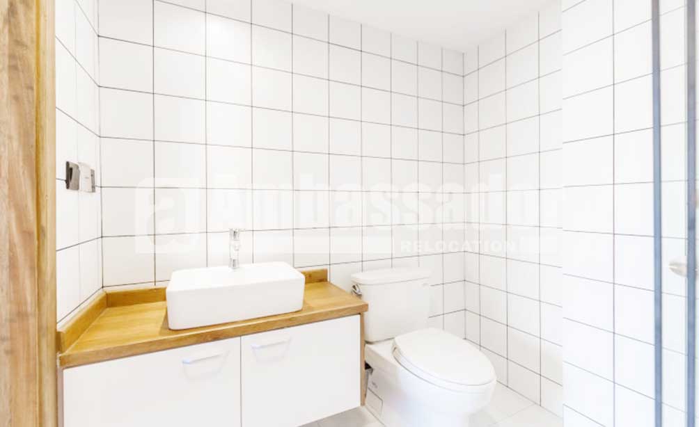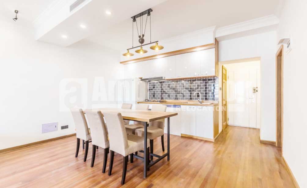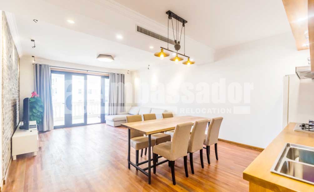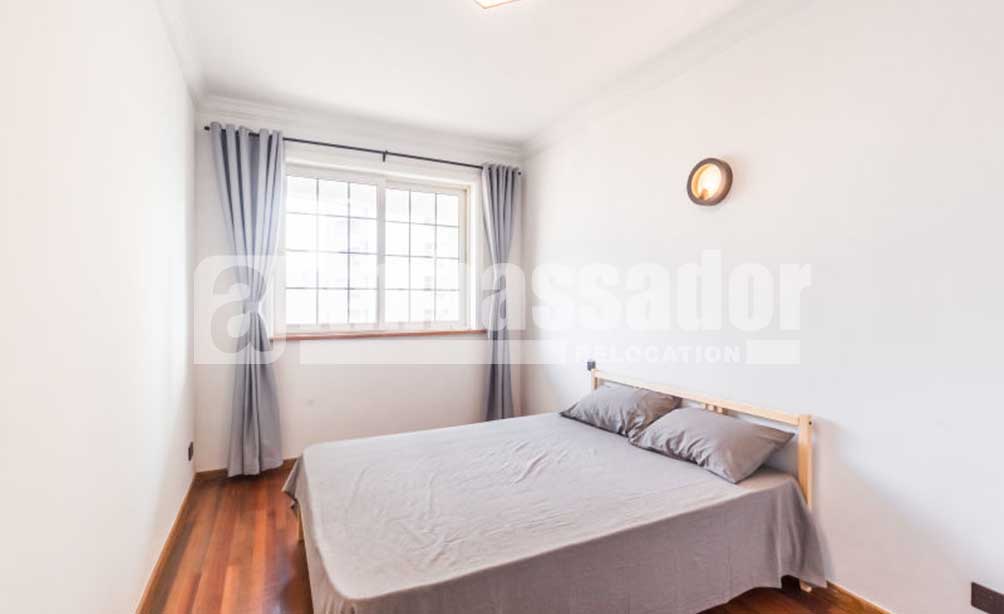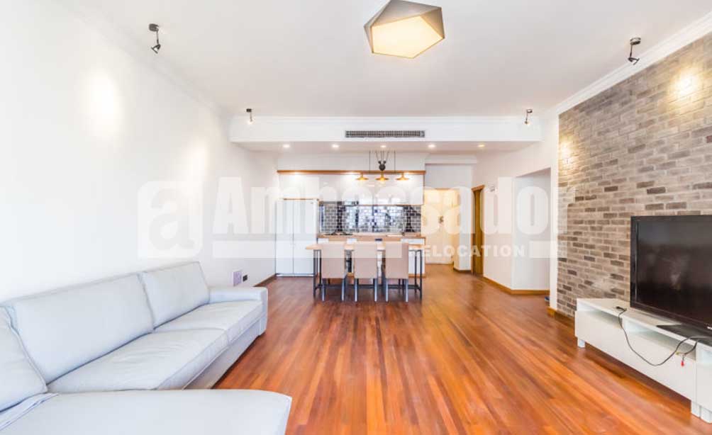 A spacious apartment with 4 bedrooms feature a airy and bright living room with floor to ceiling window. Retro brick TV wall and elegant wood flooring build a vintage style. The cool open kitchen with modern appliance is arms reach from a large wood dinning table. Bedrooms are warm and airy. Floor heating system is available to bring warmth in cold winter. Located on the high floor in this building, you can take a nice view of blue sky, white clouds, red roof and green trees.