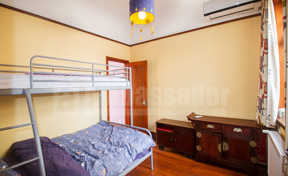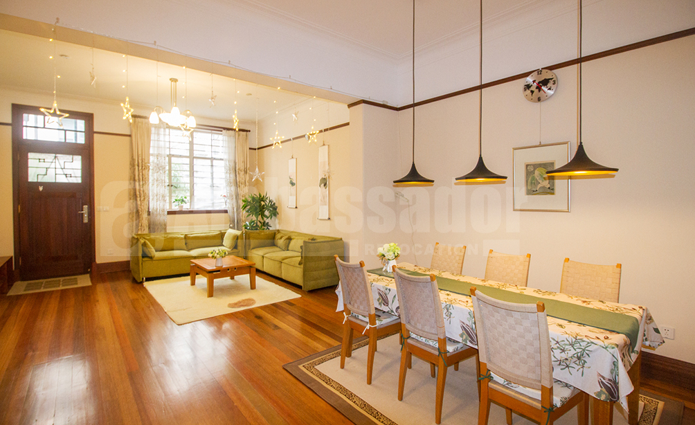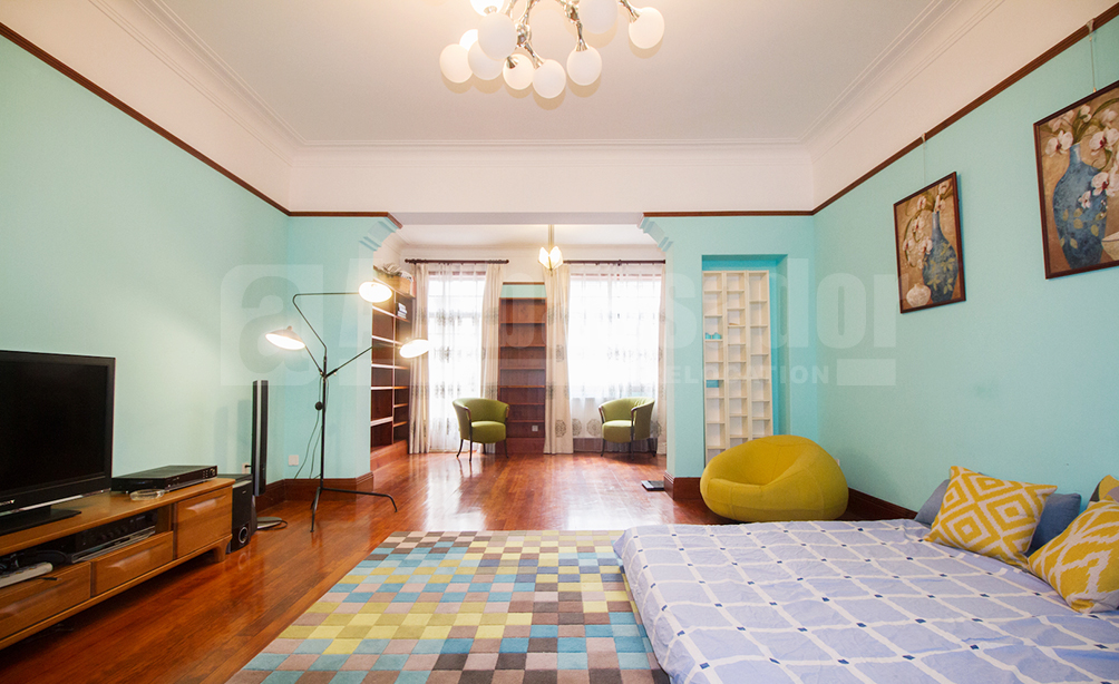 A dreaming 5-bedroom lane house located in the former French Concession.The colorful furniture and paintings are attractive for families with children. Especially, there is a room decorated with lovely chandelier and furniture. The house is covered with dark wooden floor. Drawing room is decorated with colorful carpet and blue painting. Besides, the house also provides a 15 square meters garden and a patio and a sauna room.