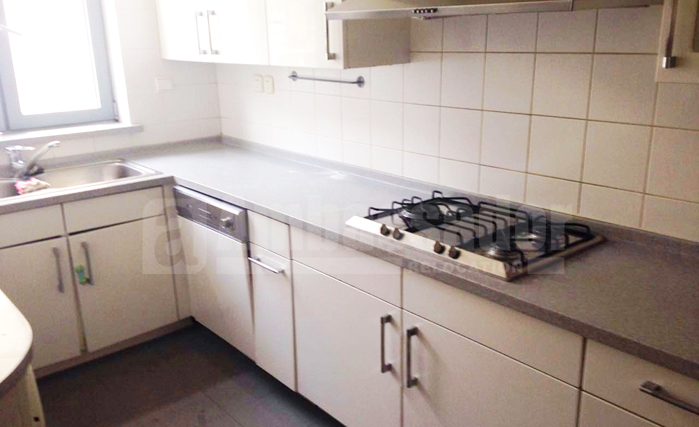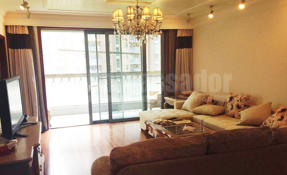 This is a beautiful 3-bedroom apartment. Living room is decorated with a luxurious chandelier and gentle color furniture. The apartment is covered with polished dark wooden floor. French windows make the house light. Besides, there is a long balcony, which is an ideal place for you to enjoy the pleasant time.