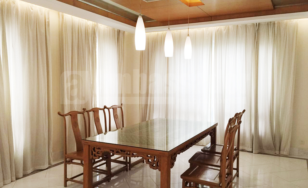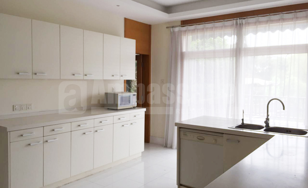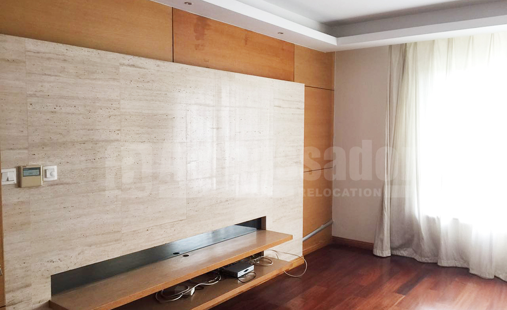 This spacious villa located in a green and tranquil environment, next to a river. It is great to have such a livable environment. The inner is simply furnished with Chinese classical dinning table and chairs. There is an open-plan kitchen decorated with milky white cupboards. The house is covered with floor heating. What's more, the villa also owns a 1000 square meters private garden for any outdoor activities but no pets please.