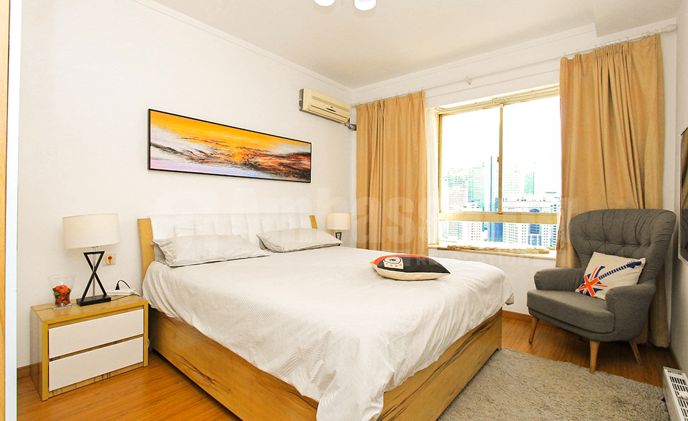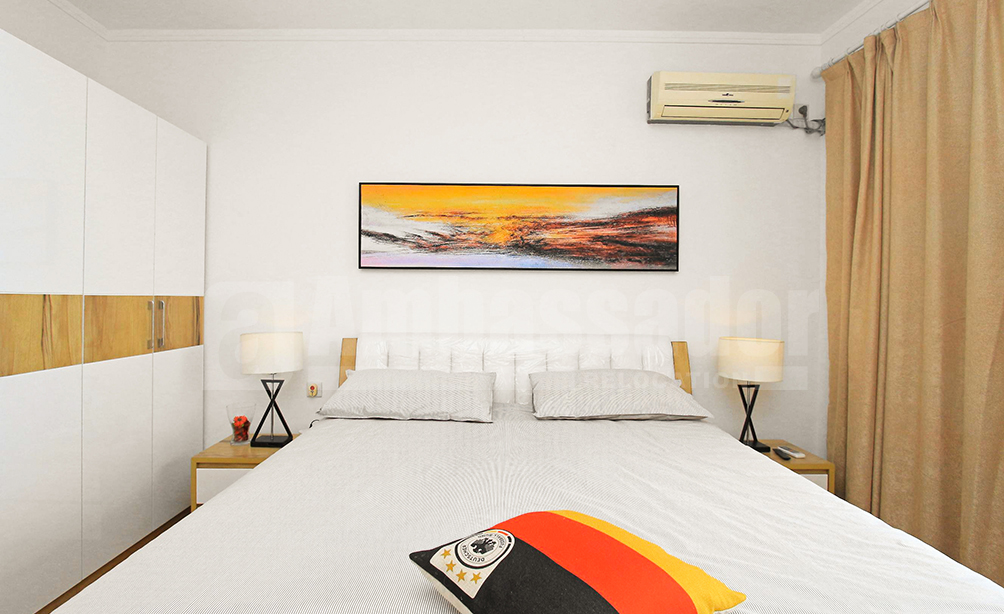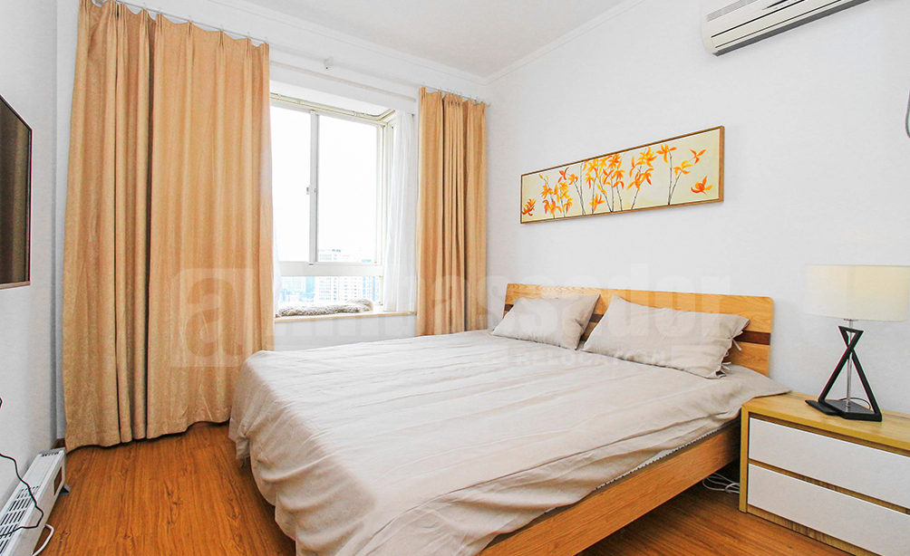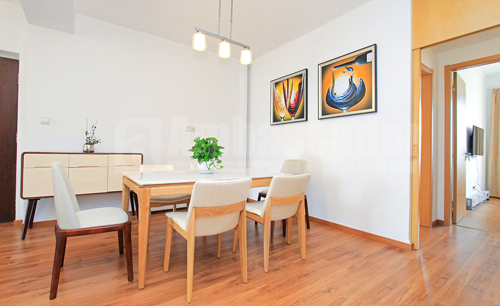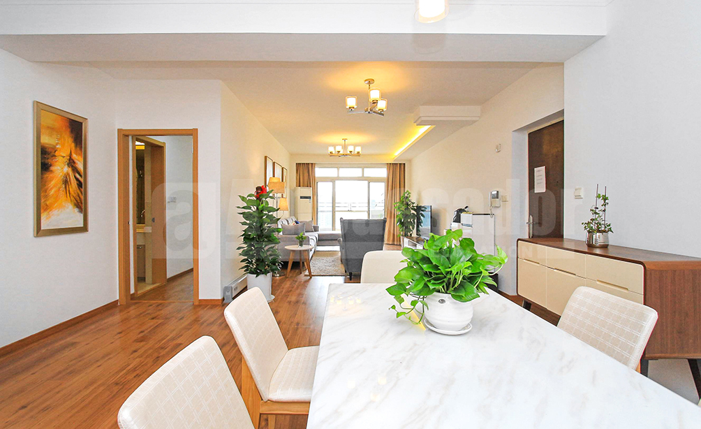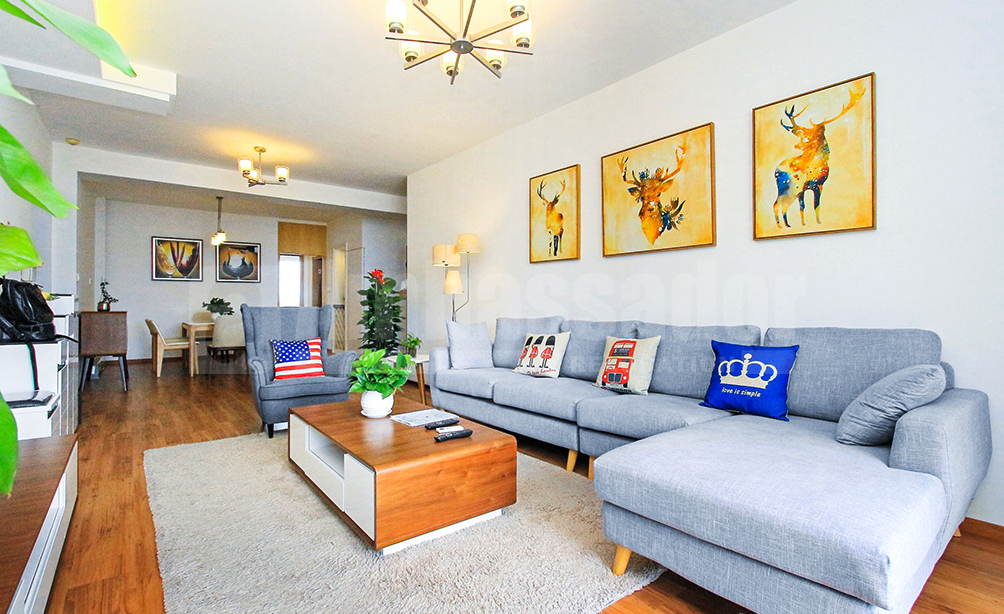 This is a 3-bedroom Nordic style apartment, furnished with stylish wooden furniture and fabric sofa and chairs. Light color and tasteful pictures and printed back pads make this apartment full of spice. The apartment is covered with polished wooden floor. It is designed to be a natural and cozy living environment.