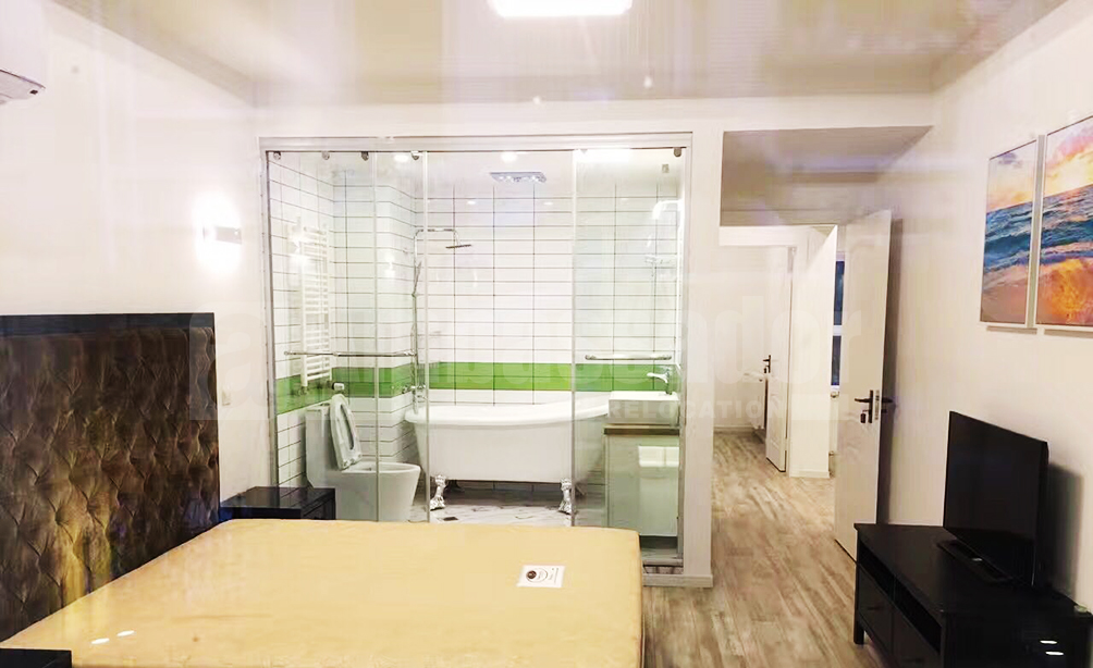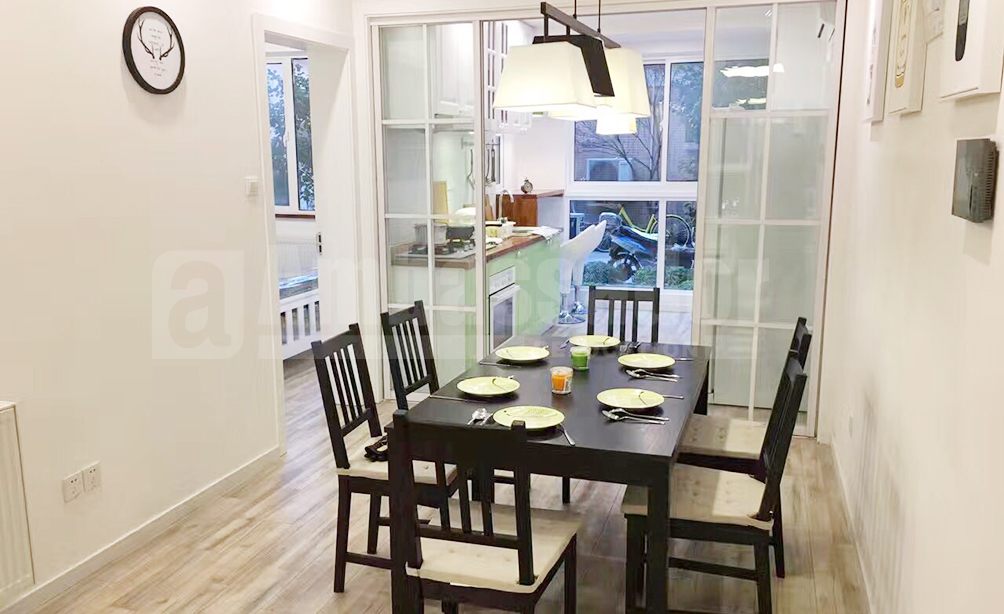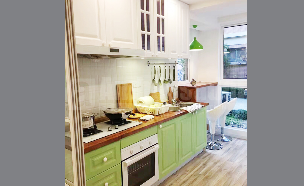 This pretty lane house is designed to be a bright and spacious retreat. Drawing room is furnished with minimalist furniture, such as its light gray fabric sofa, tables and cabinets. What's more, there are some tasteful pictures decorated the room. Kitchen and bathroom are decorated with refreshing green color, like the light green cupboard. In addition, the house provide a lovely terrace for you to have a pleasant time. It's also owns an enviable location on downtown.