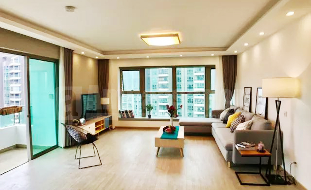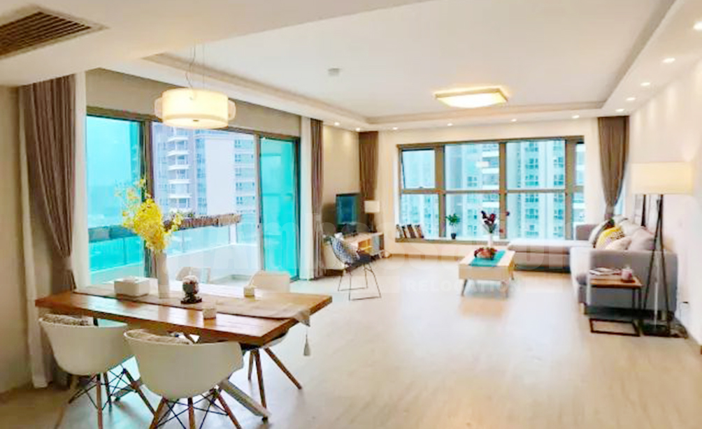 A bright and spacious 4-bedroom apartment located on Wuding Road. 5 minutes walk to the metro line 7 and 800 meters away from Plaza 66. It is more closer to western restaurants like The Commune Social as well as many bars like UVA wine bar and Manhattan and recreational clubs. The apartment is fully furnished with IKEA furniture. Broad French windows in drawing room and bedrooms makes the apartment sunny and airy.