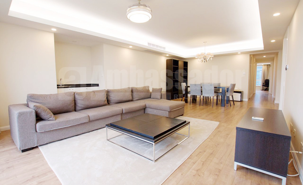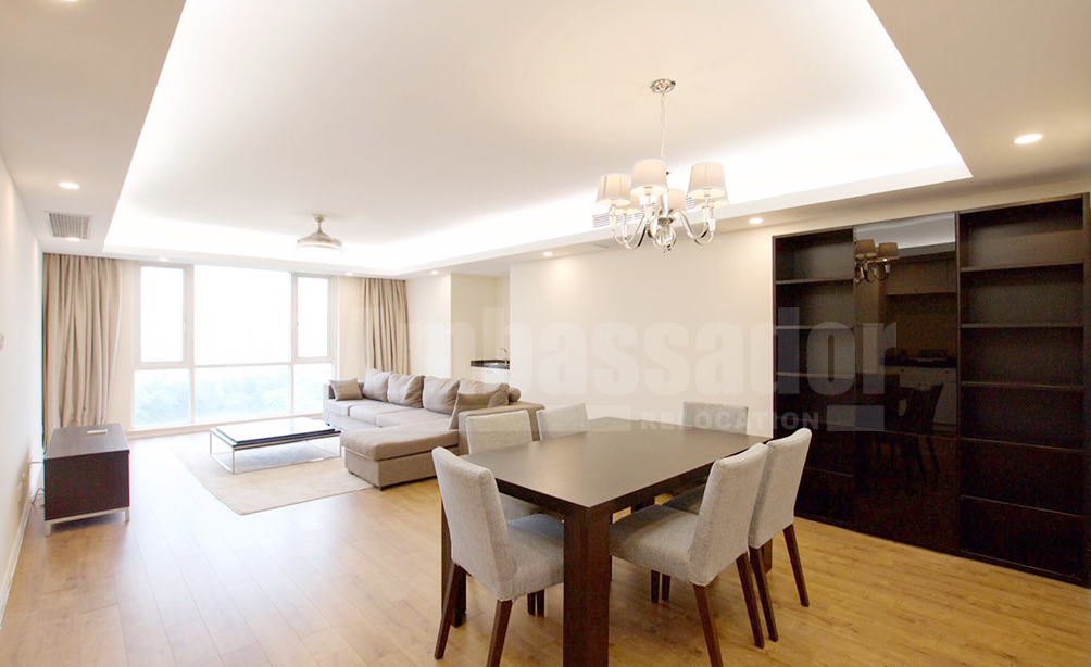 A spacious and bright 3-bedroom apartment located on Changning Road, 3 minutes walk to the metro line 2, line 3 and line 4. Close to many shopping malls like Cloud Nine as well as restaurants and coffee bars. The apartment is partly furnished with stylish IKEA furniture and equipped with floor heating, A/C and bathtub.