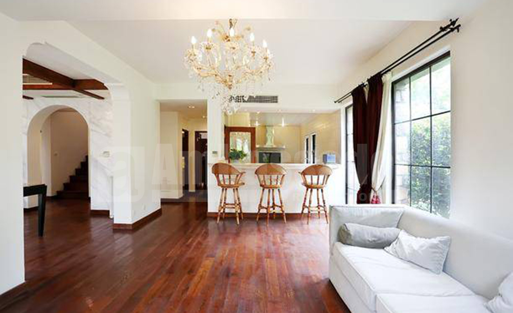 A luxurious 4-bedroom villa located on Jinhui Road in MInghang district. This villa is partially furnished and equipped with bathtub, double door refrigerator, washing machine and dryer and fine chandeliers. This compound is well-equipped with amenities like international schools, recreational clubs, shopping mall, restaurants and so on. The villa also offers you a beautiful garden.