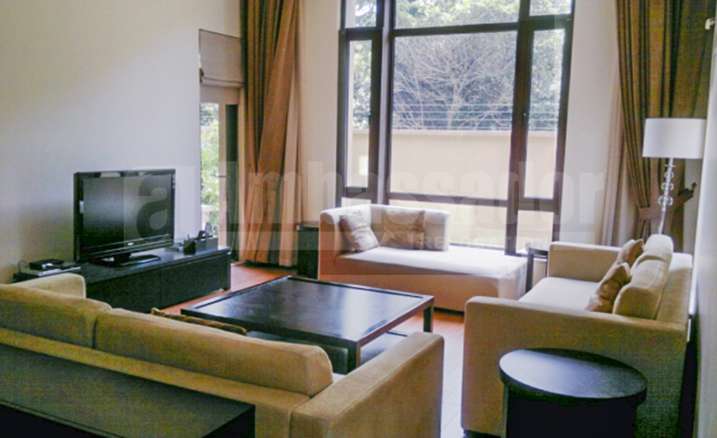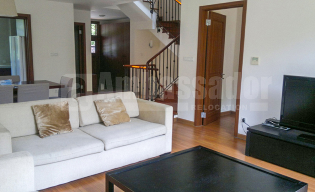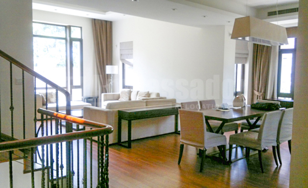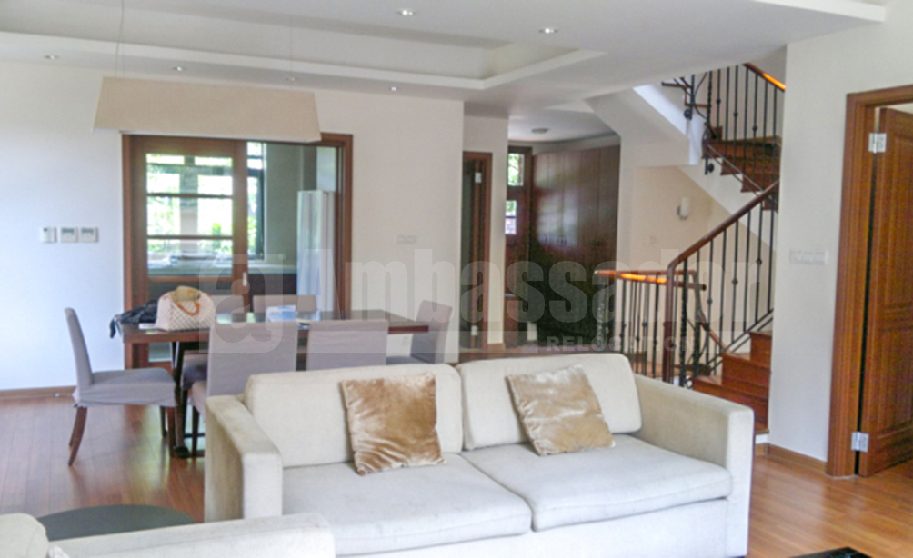 A spacious 5-bedroom villa located on Zhuxin Road in Minhang district. Shopping mall, restaurants, cafes, park and many international schools. Its compound is in Tudor style . The villa includes a 60 square meters garden. It is also fully furnished and equipped.