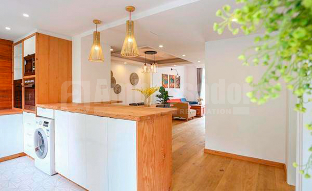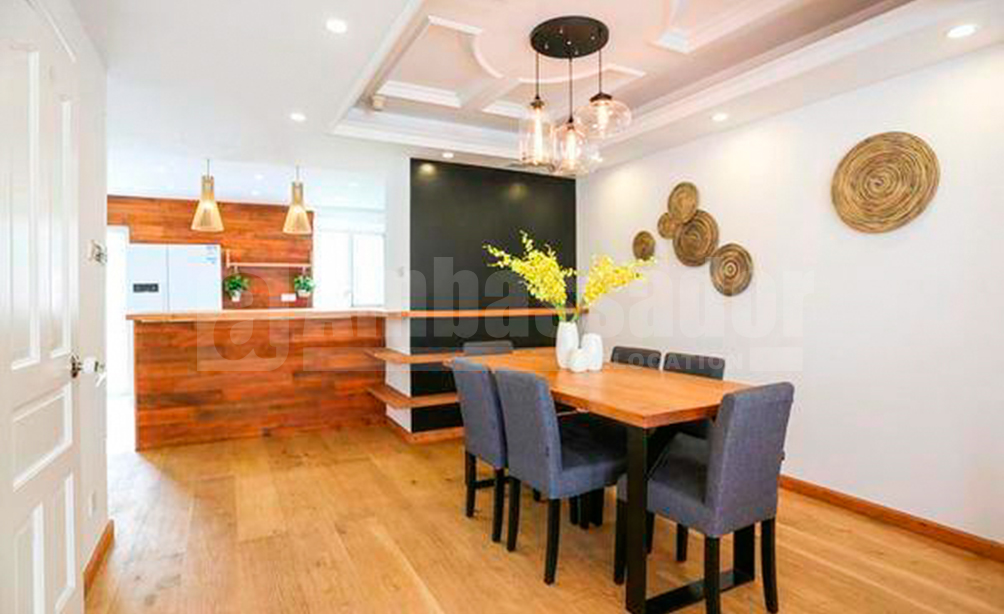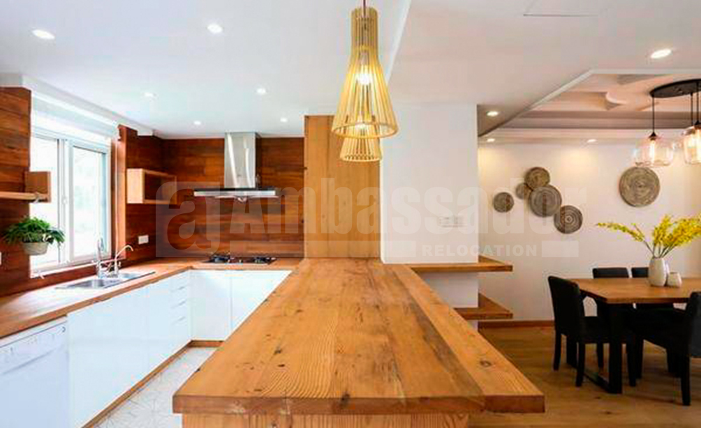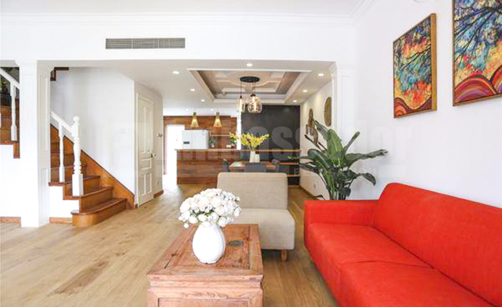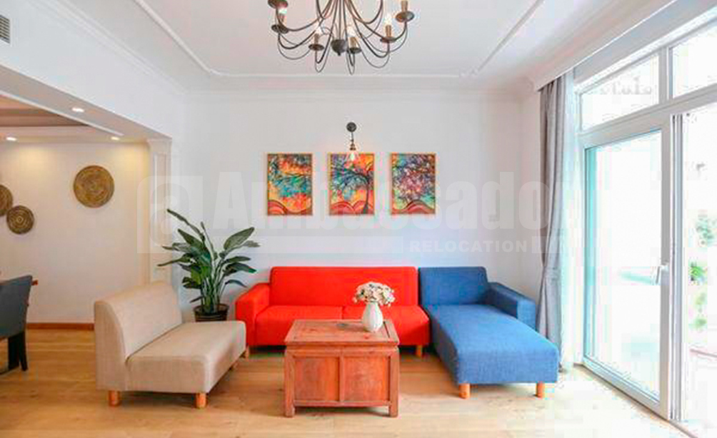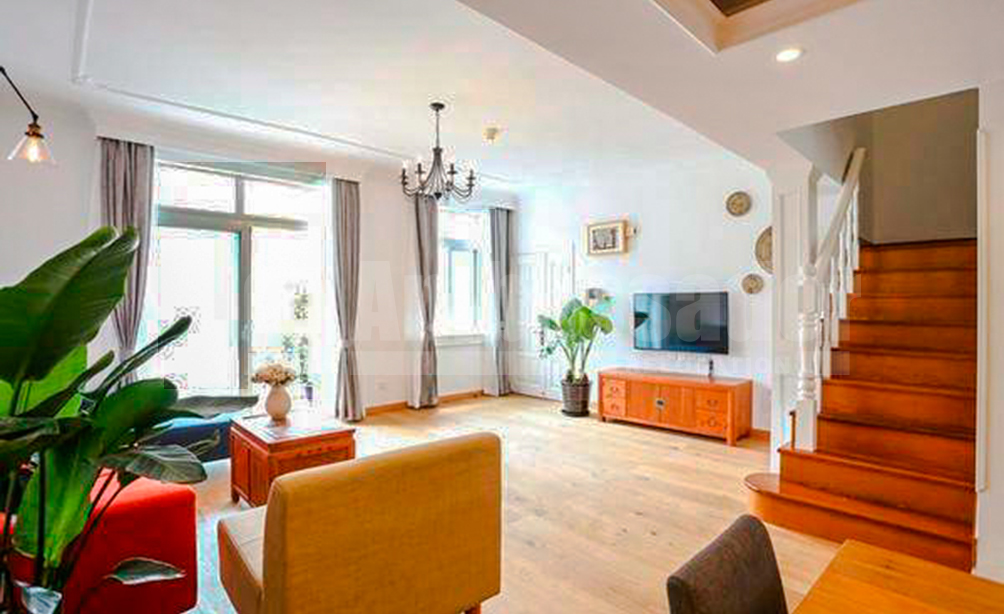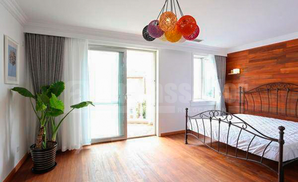 This pretty 4-bedroom villa is located on Hongqiao Road in Changning district. 5 minutes walking distance from Shuicheng Road station of metro line 10. shopping mall, restaurants, abrs and cafes are within 5 minutes walking distance. It is not only situated in a convenient and bustling location but also in a quiet and livable compound. the villa is beautifully decorated and furnished with natural style furniture.